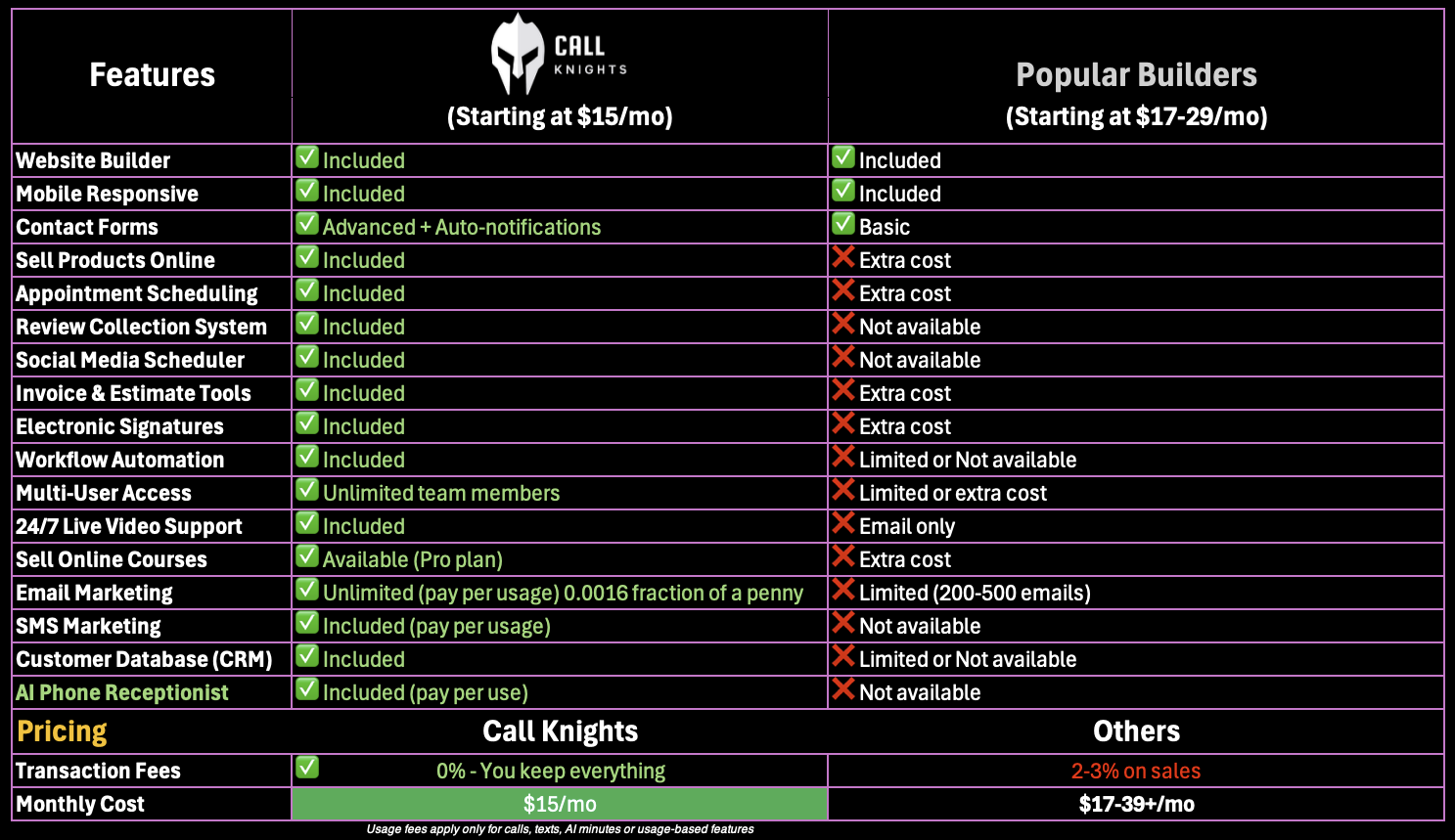 Most small businesses who DO use these features pay $30-50 total ($15-39 plan + $15-25 usage). But unlike other builders that force you to pay for features you don't use, you only pay for what you actually send.